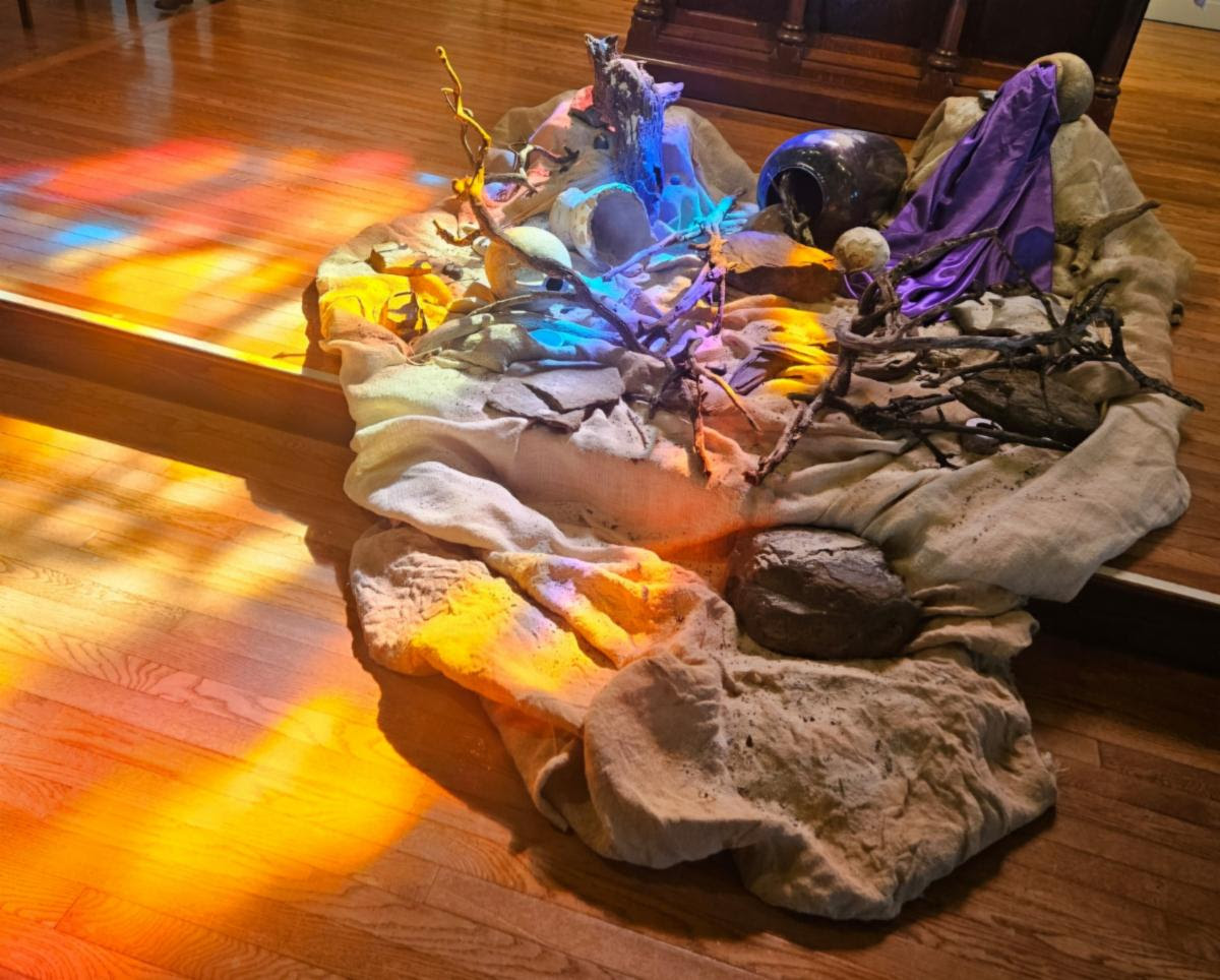 Have you been checking out the transformation of the altarscape during Lent? Each week items are added to go with the gospel reading. The colors of the stained glass add to the display.
